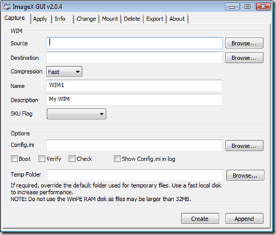 The ImageX GUI is a native application for the x86 and x64 platforms that will also work in Windows PE (WinPE). There is also a COM component version included that implements some of the basic functionality for direct use in languages such as VBScript.