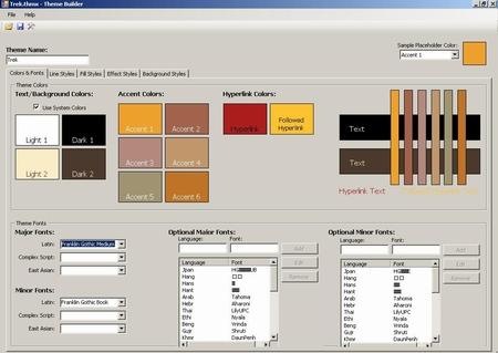 The Open XML Theme Builder is a tool that helps with the creation of theme files (*.thmx) that encapsulate the visual appearance and formatting of a document in order to help create a better looking document. So it helps in creation of custom themes or modify the existing ones. Theme files can be used by Microsoft Office PowerPoint 2007, Excel 2007, and Word 2007.